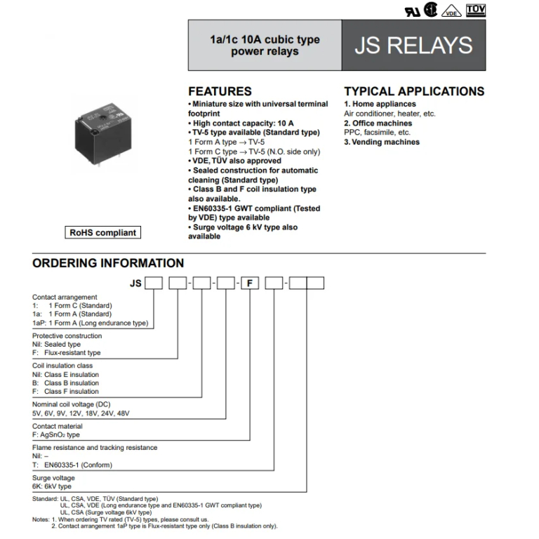 JS1-5V-F JS1 12V F JS1-24V-F AJS1319F AJS1311F AJS1312F 10A 5Pin Power Relay DC5V 12V 24VD