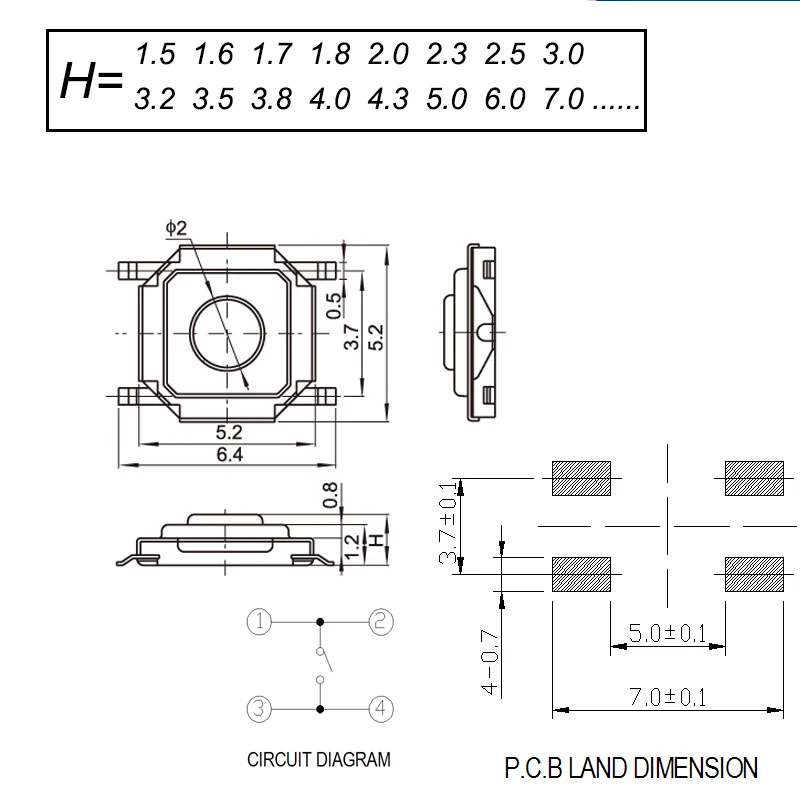 5.2×5.2mm Height From 1.5mm To 9mm Momentary Metal Tactical Push Button Switch SMT 4PIN Mini Key Button 260G Force