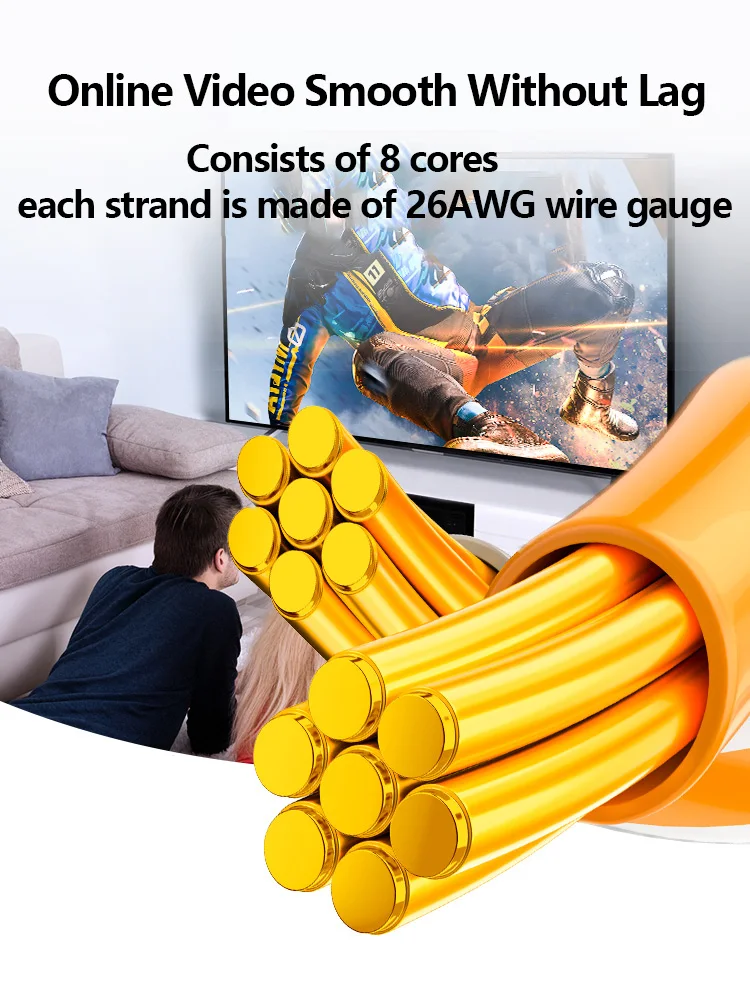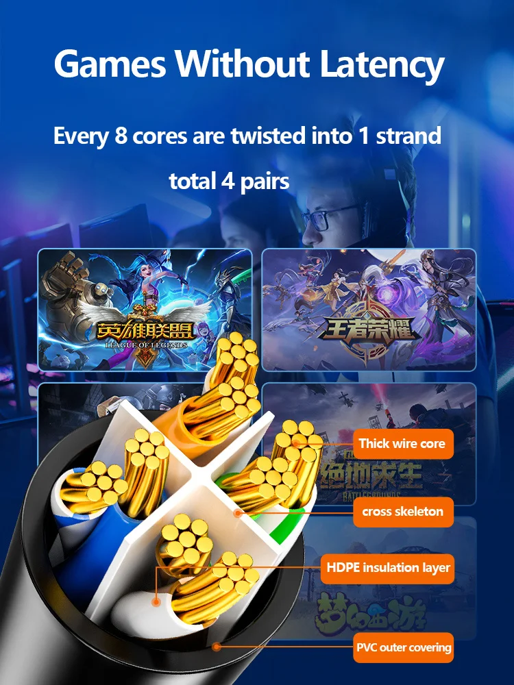 Every 8 cores are twisted into 1 strand, total 4 pairs. Each pair is isolated by the cross skeleton to reduce mutual signal interference. Reduce the network packet loss rate, network speed is more stable.