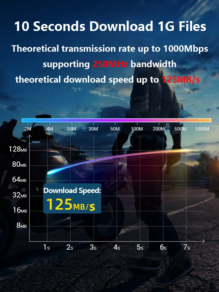 Theoretical transmission rate up to 1000Mbps, supporting 250MHz bandwidth, theoretical download speed up to 125MB/s.