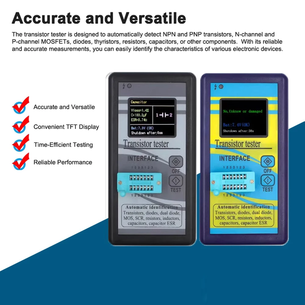 Accurate and Versatile: The transistor tester is designed to automatically detect NPN and PNP transistors, N-channel and P-channel MOSFETs, diodes, thyristors, resistors, capacitors, or other components. With its reliable and accurate measurements, you can easily identify the characteristics of various electronic devices.