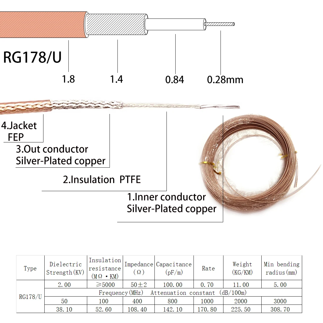RF Coaxial Cable RG178 RG174 RG316 RG58 RG142 RG405 RG402 Wire Low Loss 50 Ohm. High-quality RF coaxial cables for reliable signal transmission in various applications. Available in different types (RG178, RG174, RG316, RG58, RG142, RG405, RG402) to meet specific frequency and impedance requirements. These low-loss 50 Ohm cables are ideal for radio frequency applications, including antennas, RF amplifiers, and data transmission systems.
